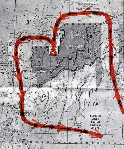 I stuck my finger on the map (an aviation chart of the Grand Canyon, actually) and picked a small dirt landing strip called Tuweep (L50) on the North Rim. I poked around on the World Wide Web and found out that it's 12.5 Km (7.8 miles) on a dirt road from the unattended airport from the airport to an amazing view at the rim. The pilot who used to work at the ranger station moved to Alaska. I planned my two-hour flight and checked the weather. The Weather Channel forecast 31° C. (88° F.) with isolated thunderstorms in the afternoon.