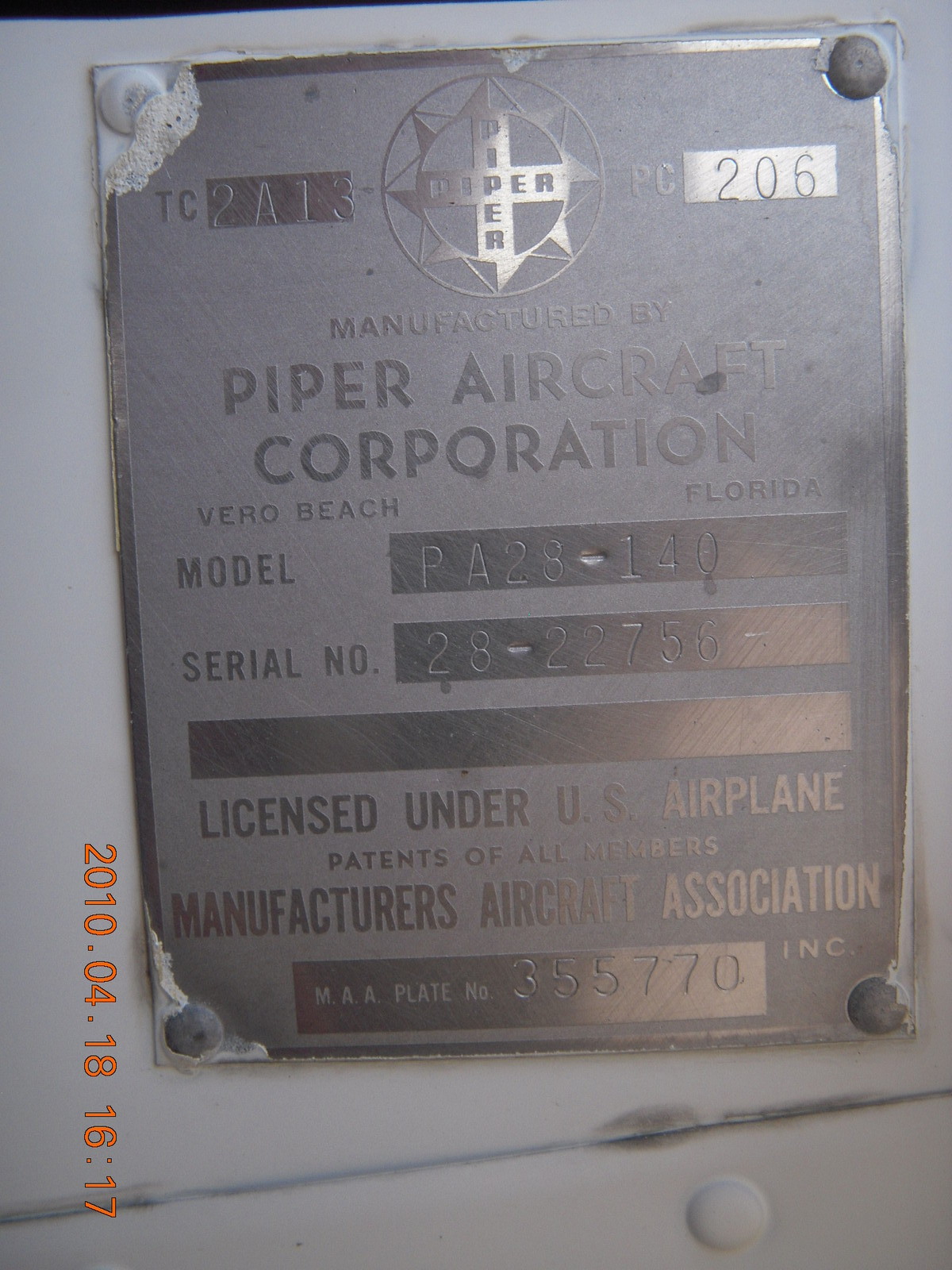 N4372J data plate N4372J at Furnace Creek (L06)