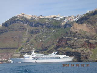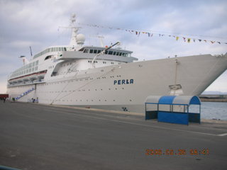 Our cruise ship MS Perla (Περλα in Greek) carried 770 of us eclipse weenies. In contrast, on my first eclipse trip, the Carnival ship Fascination had close to 3000 passengers, so this was a smaller boat. While they didn't have the exercise facilities I liked aboard the Fascination, seven "cardio" machines instead of jogging track and full weight room, they had the same full-service attitude in both my steward and the dining-room staff. They also had three computers with satellite Internet service, expensive for images, cheap for text e-mail like mine, and annoyingly slow in its response time.