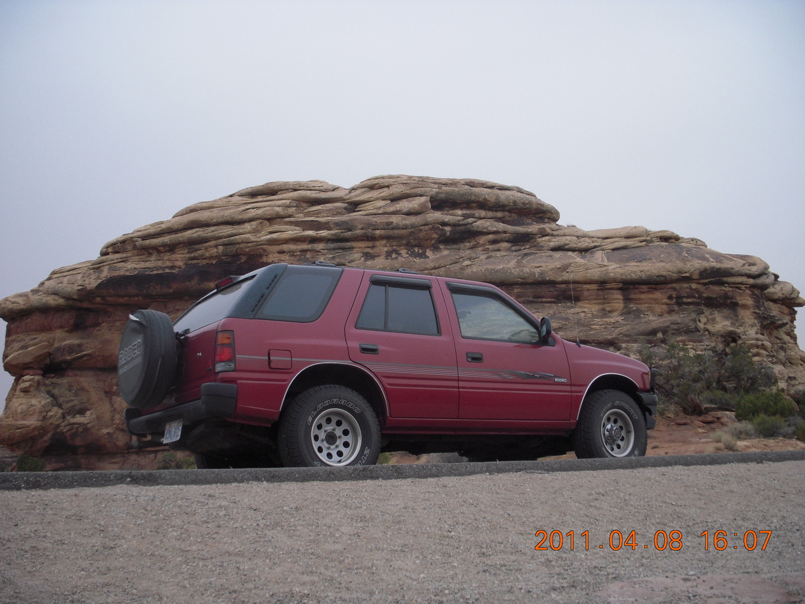 2011 April 8, Friday, 7j8-vtz.jpg * dirt road drive to Anticline Overlook - Rodeo seen from below - looks tough